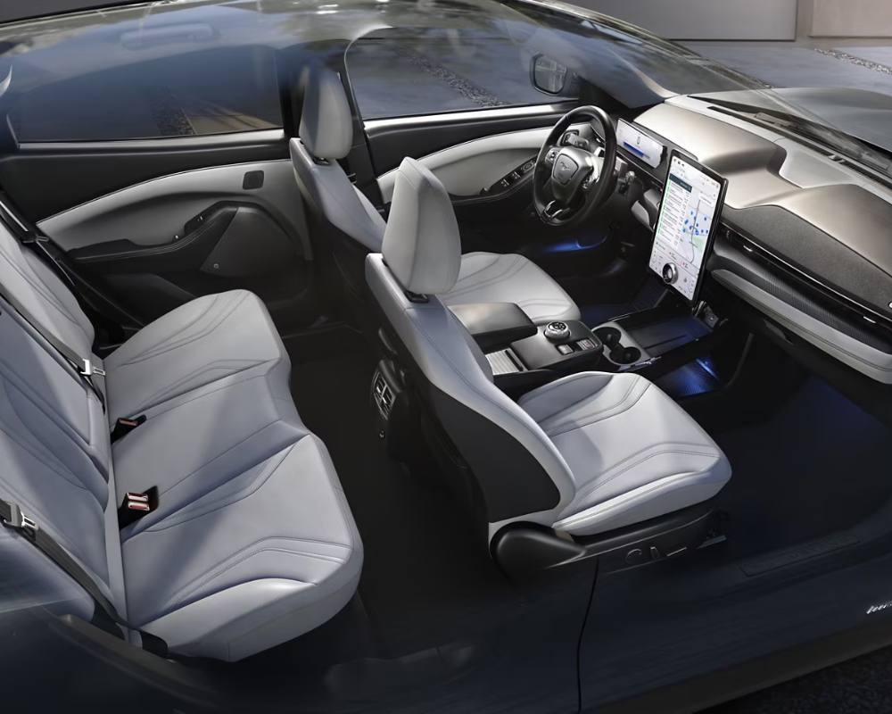 Step inside the Mustang Mach-E and you'll find a sanctuary of modernity and comfort. The vehicle boasts a spacious interior with premium materials and cutting-edge technology, including a 15.5-inch touchscreen integrated with SYNC 4A. This system enhances your driving experience by seamlessly connecting you to your digital world.